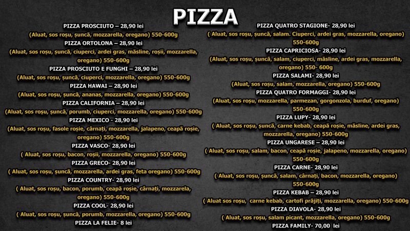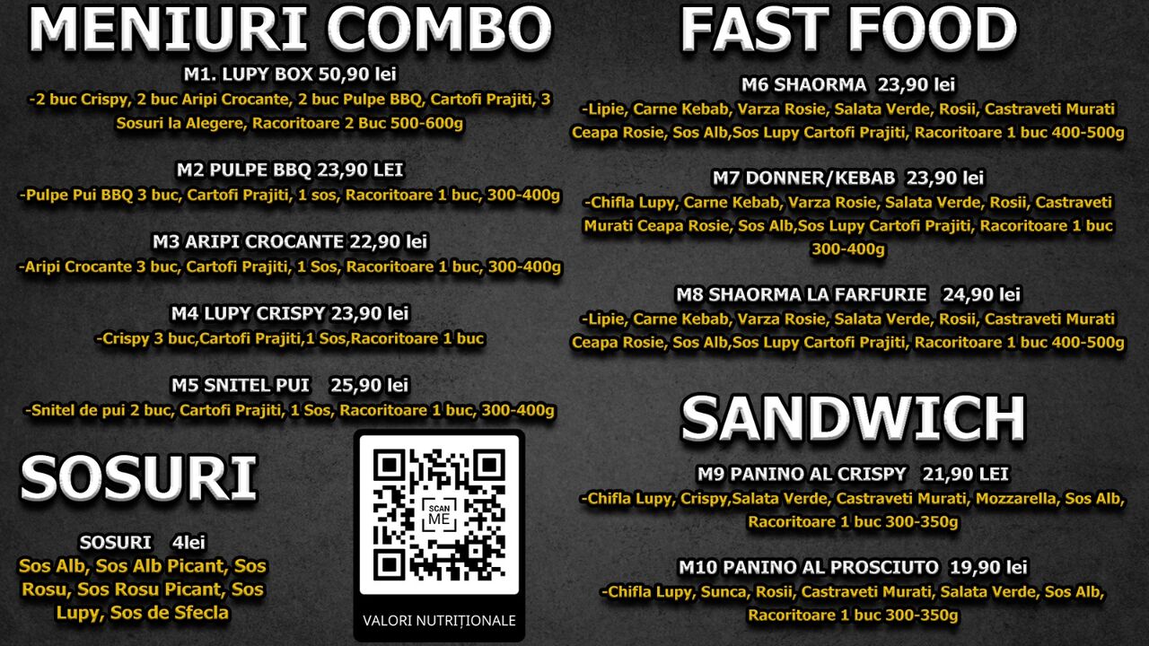 Lupy Food din Satu Mare este un fast food modern și primitor, cunoscut pentru preparatele sale delicioase și servicii rapide. Meniul variat include o gamă largă de burgeri suculenți, crispy strips, sandwich-uri proaspete, salate crocante și cartofi prăjiți aurii, toate pregătite din ingrediente de calitate. Atmosfera prietenoasă și decorul vibrant fac din Lupy Food locul perfect pentru o masă rapidă și gustoasă, fie că ești în pauza de prânz, ieși cu prietenii sau ai nevoie de o gustare pe fugă. Lupy Food te așteaptă cu preparate savuroase și servicii excelente în inima Sătmarului.